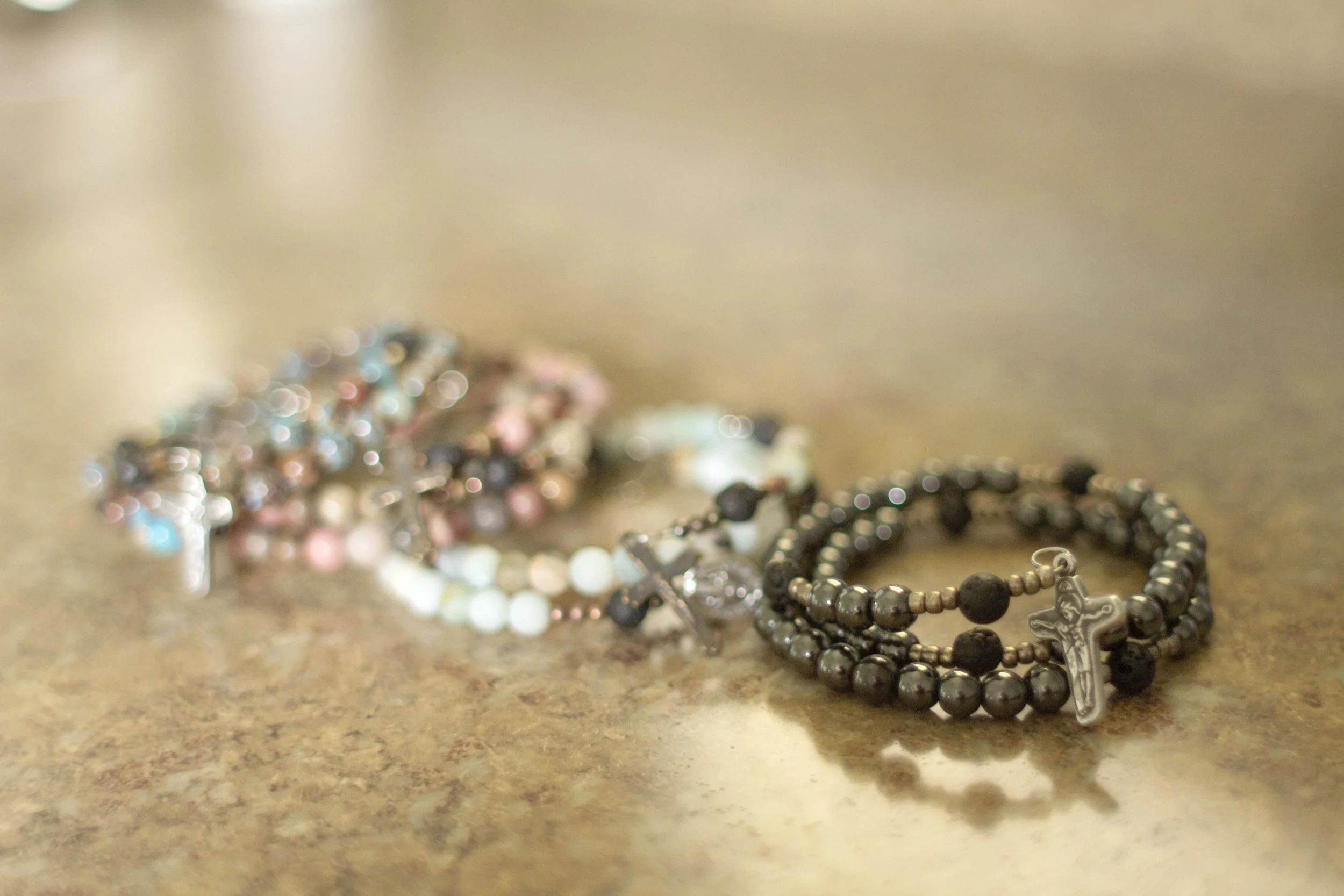 The bracelet styled aromaRosaries offer the unique benefits of portability and aromatherapy as well as serving as a fashionable conversation piece that will open doors to share the message of the rosary with others. You will never be without a rosary and each days mysteries will linger with you impacting your prayer life throughout the day.