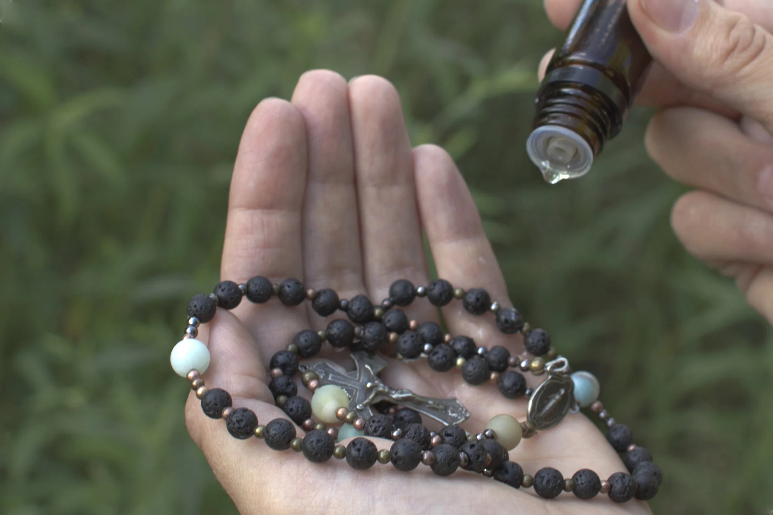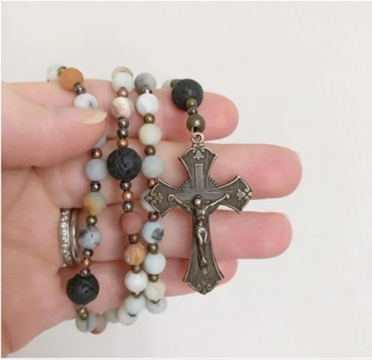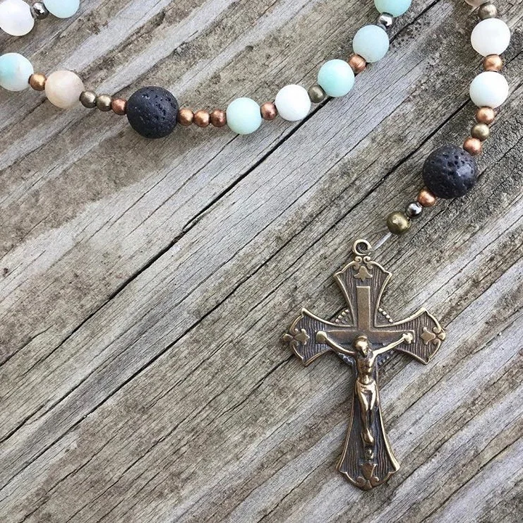 The original aromaRosary is designed with rustic gemstones and lava rock which hold and diffuse the essential oils. They are finished with simple pure bronze crucifixes and centers. These rosaries are perfect for everyday use and will enrich your meditation and inspire your family. Built strong and sturdy, these rosaries will bless you for years to come.
